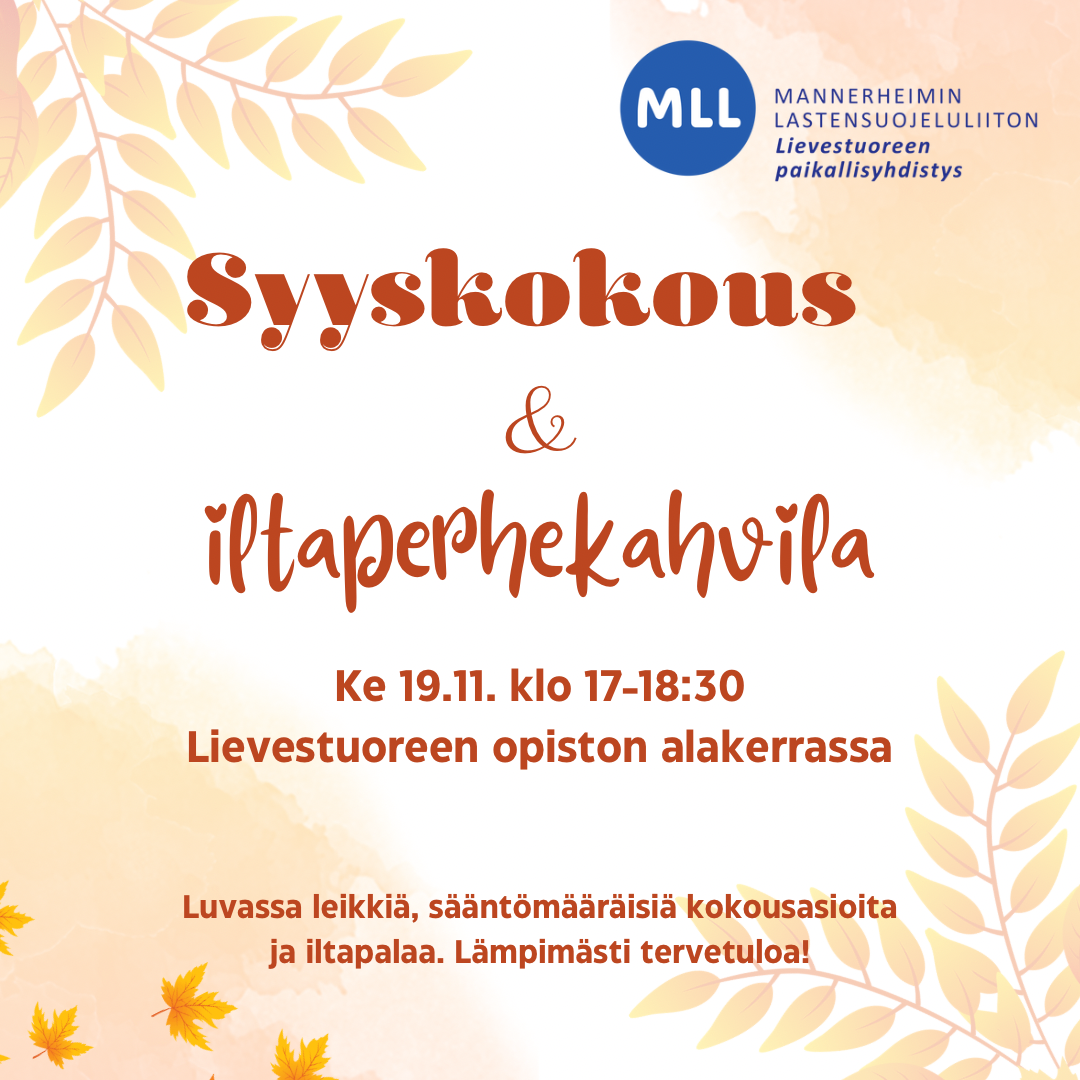 🌻 Lämpimästi tervetuloa MLL Lievestuoreen sääntömääräiseen syyskokoukseen ja iltaperhekahvilaan! 🌻 Keskiviikkona 19.11.2025 klo 17-18:30 Lievestuoreen kansalaisopiston alakertaan. Syyskokouksessa…